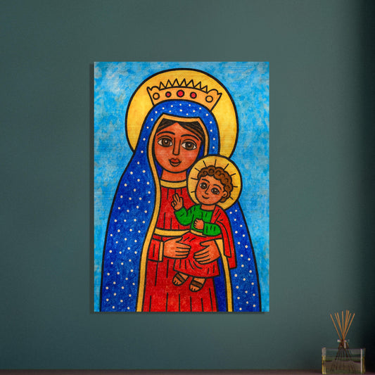 Mexican Naïf Art Icon of the Virgin Mary and Child – Brushed Aluminum Dibond Plaque